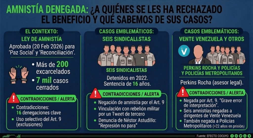 El caso de Alcides Bracho, Gabriel Blanco, Emilio Negrín, Reynaldo Cortés, Néstor Astudillo y Orlando Meléndez, los seis sindicalistas sentenciados a 16 años de prisión por la jueza del Tribunal 2 de terrorismo, Grendy Duque, por la presunta comisión de los delitos de conspiración y asociación para delinquir, tambien genera preocupación en las organizaciones defensoras de derechos humanos debido a la negación de la amnistía, el pasado 17 de marzo.