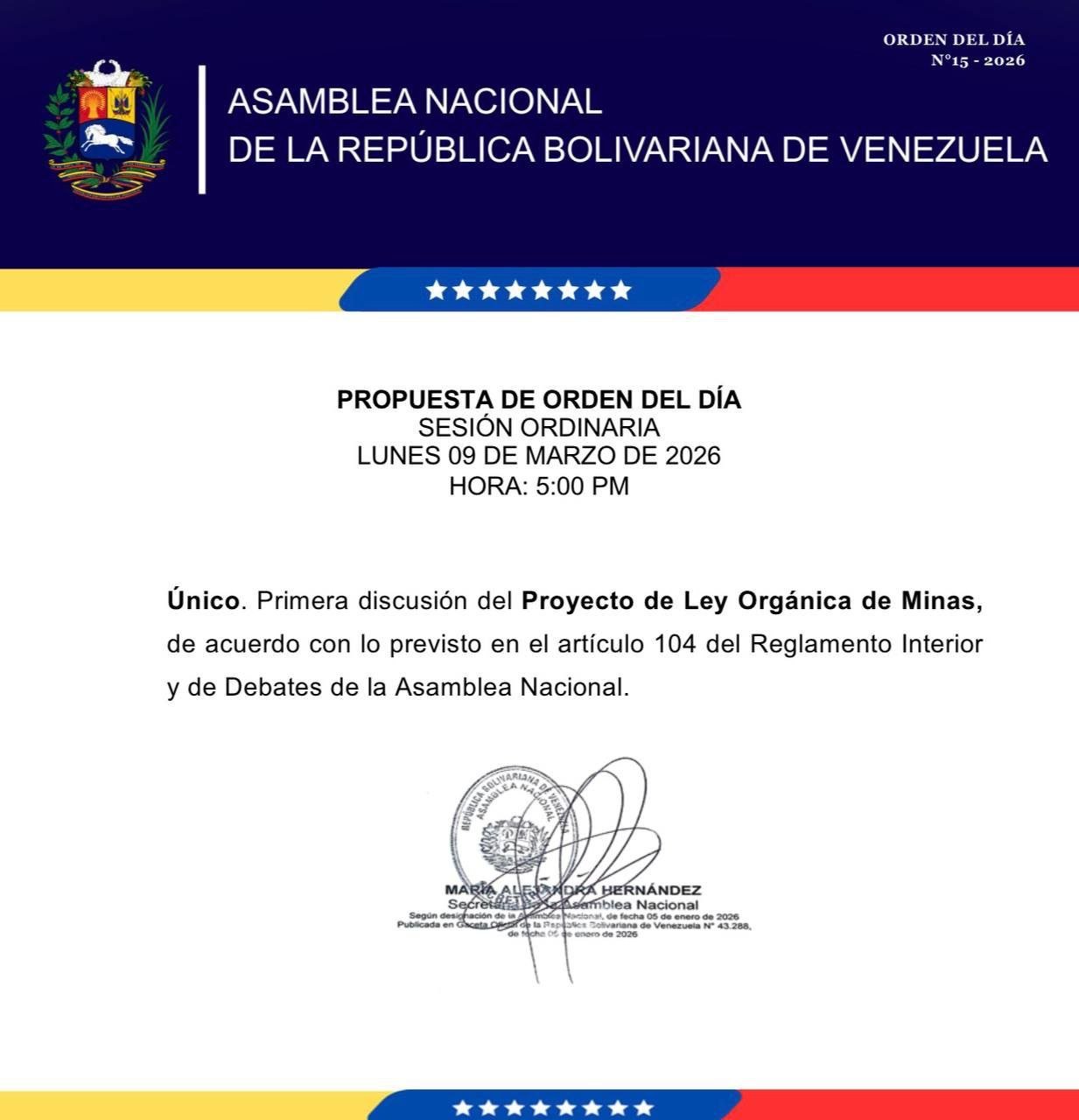 La Asamblea Nacional (AN) realizará este lunes, 9 de marzo, la primera discusión sobre el Proyecto de Ley Orgánica de Minas.