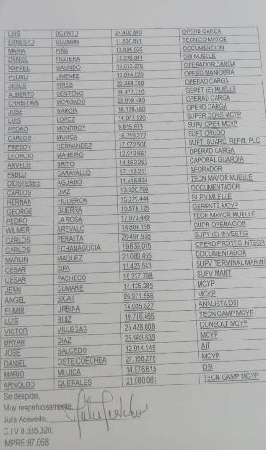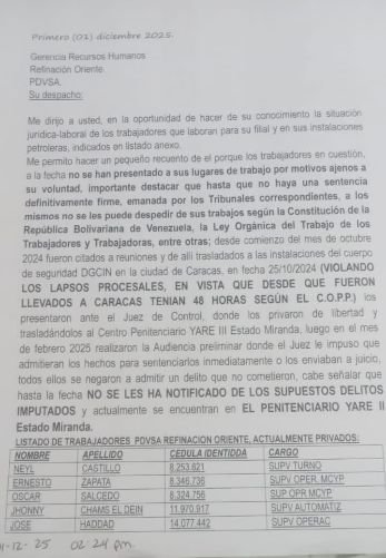 "Ilegalmente Pdvsa (Petróleos de Venezuela S,A,) los sacó del sistema, es decir, ya los están despidiendo y allí hay trabajadores con 20, 25, 30 y 35 años de servicio, trabajadores que tienen ocho y nueve vacaciones vencidas. Pdvsa, de una forma unilateral, sin llegar a acuerdos, sin escuchar la voz de trabajadores y la dirigencia sindical, simplemente los está despidiendo. Esto ha generado un gran descontento en la masa laboral y sus familiares, por eso estamos aquí exigiendo la libertad de los trabajadores y esperamos que sean devueltos a sus sitios de trabajo", manifestó.