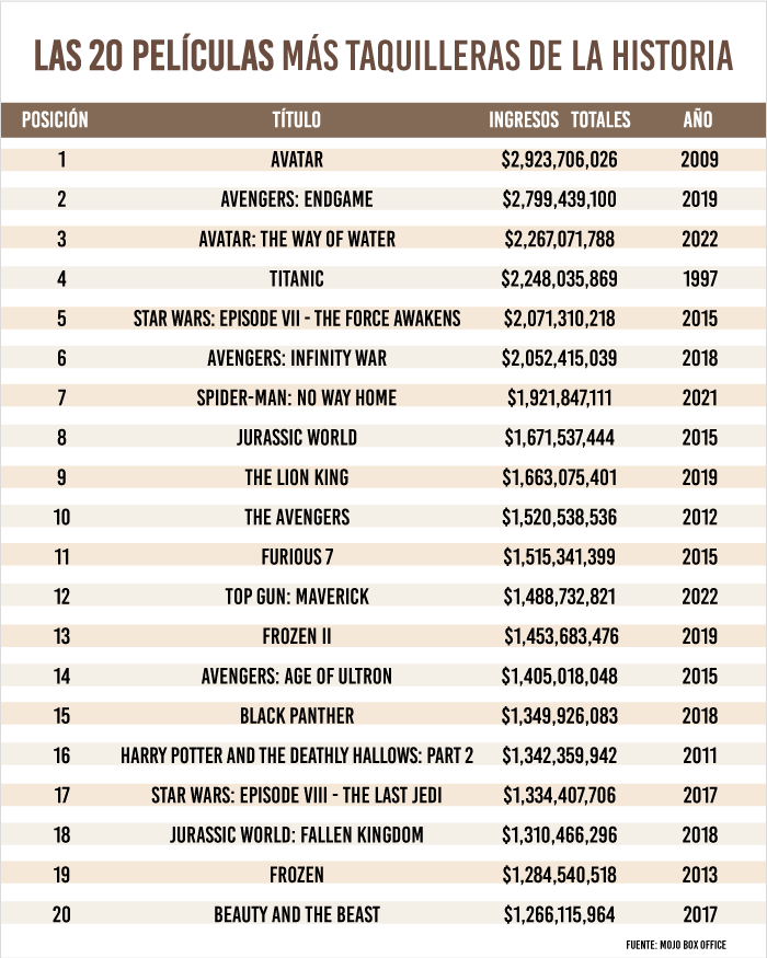 Pero el verdadero revolcón lo ha dado en los últimos tres meses Avatar: El camino del agua (Avatar: The way of wáter, 2022) de James Cameron. En su recorrido, que comenzó el 16 de diciembre y aún se mantiene, la secuela de Avatar (2009), se convirtió en la tercera más taquillera de la historia, arrebatando este puesto a Titanic (1997), también dirigida por Cameron.