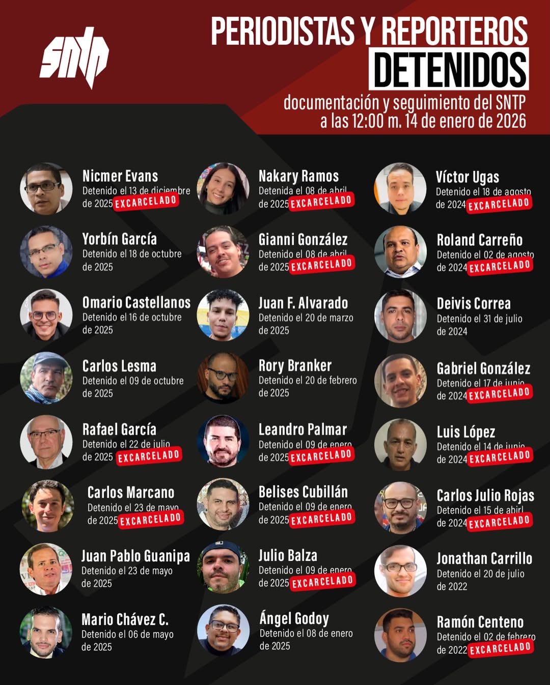 Al menos 24 periodistas, comunicadores y trabajadores de medios de la prensa permanecía privados de libertad en Venezuela, de acuerdo con el SNTP. Las detenciones, según el gremio, no responden a hechos delictivos comprobados, sino al ejercicio del periodismo independiente, a la difusión de opiniones críticas o a la militancia política de los comunicadores.