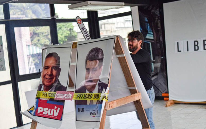 El exalcalde de San Cristóbal, estado Táchira, -que estuvo preso cuatro años y medio por "permitir" protestas antigubernamenateles en 2014- desplegó sobre la armazón un precinto de seguridad con la palabra "peligro" y, luego, encendió la motosierra, con la que cortó la obra desde arriba, haciendo caer los carteles de los dos candidatos.