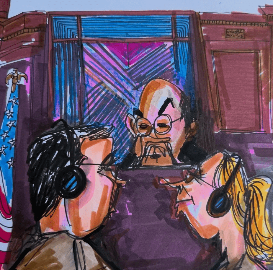 Estar dentro del tribunal no formaba parte de sus planes. Sin embargo, dos días antes de la audiencia, cuando acudió a protestar frente a la corte, algo cambió. Fue entonces cuando surgió la idea, casi como una chispa inesperada: imaginó lo interesante que sería estar adentro, en ese espacio sin cámaras ni grabaciones, capturando la escena a través de un boceto, como los que suelen verse en películas y coberturas judiciales.