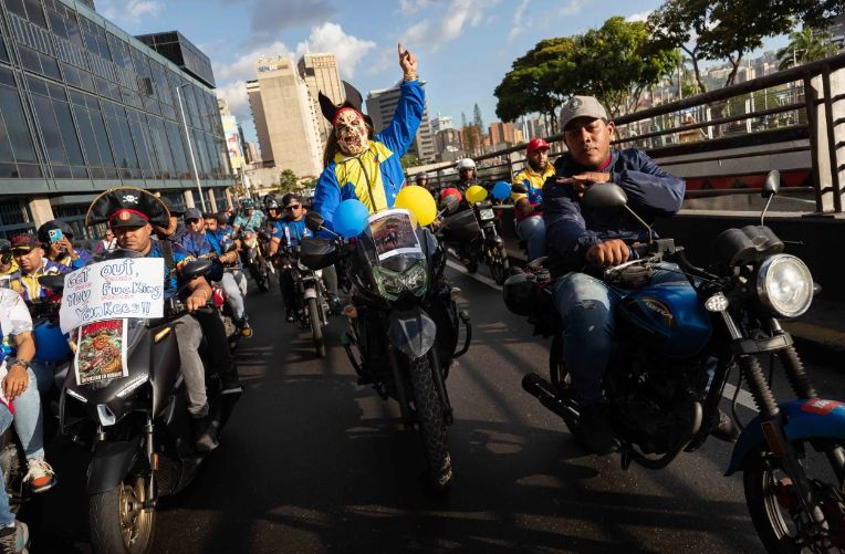Cientos de motoristas simpatizantes del chavismo, algunos disfrazados de piratas, recorrieron varias zonas de Caracas en protesta por la confiscación de dos buques con petróleo venezolano por parte de Estados Unidos y exhibieron afiches con la imagen del presidente Donald Trump con sombrero y parche.