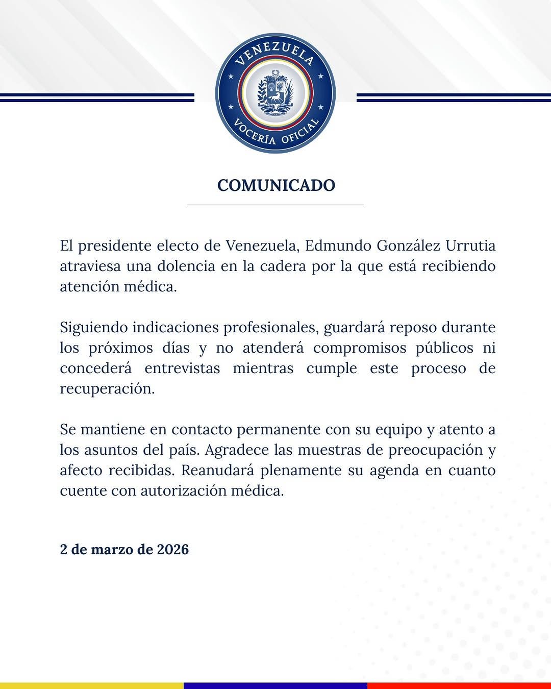 La Vocería Oficial de Venezuela informó este lunes que Edmundo González Urrutia cancelará sus compromisos públicos y entrevistas de los próximos días, debido a un problema de salud.