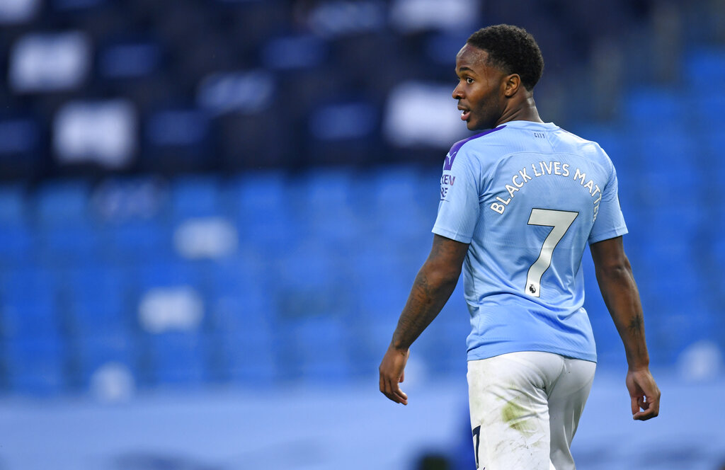 Raheem Sterling, de Manchester City, camina en la cancha durante el partido ante el Arsenal, el miércoles 17 de junio de 2020 (Peter Powell/Pool via AP)