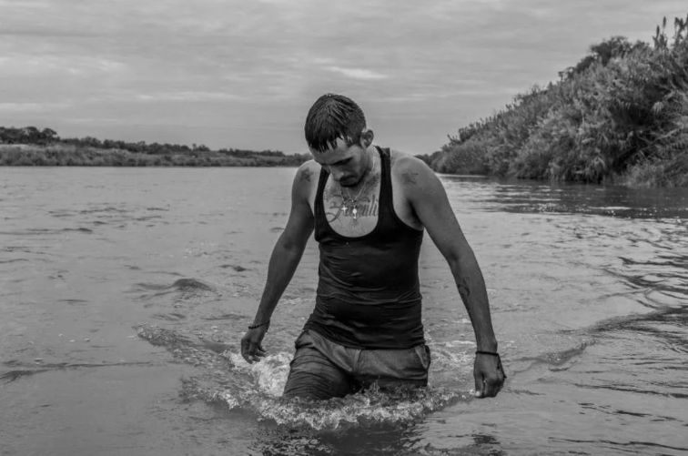Y otra captura el momento en el que cientos de personas cargadas con sus escasos enseres o llevando a sus hijos a hombros cruzan un río fronterizo.