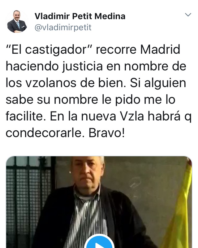 Petit escribió en la red social "el castigador recorre Madrid haciendo justicias en nombre de los venezolanos de bien".