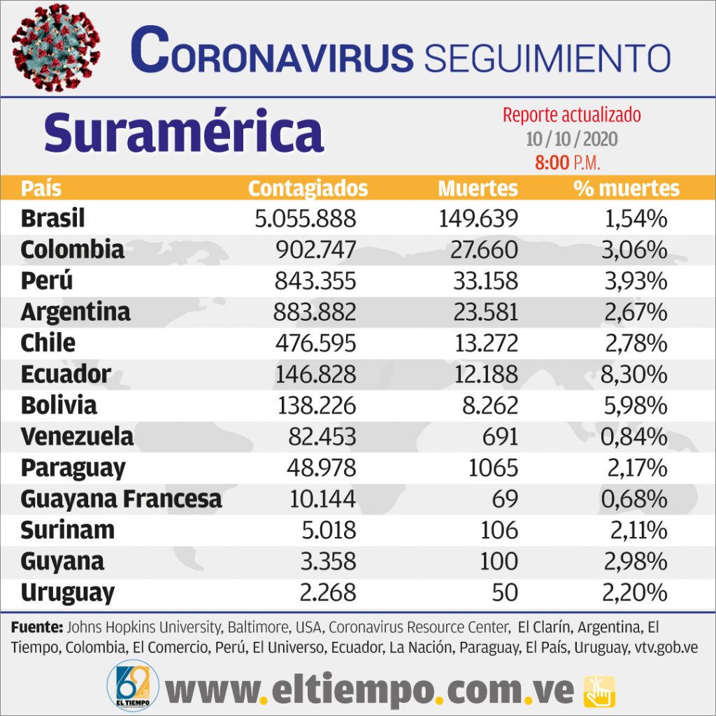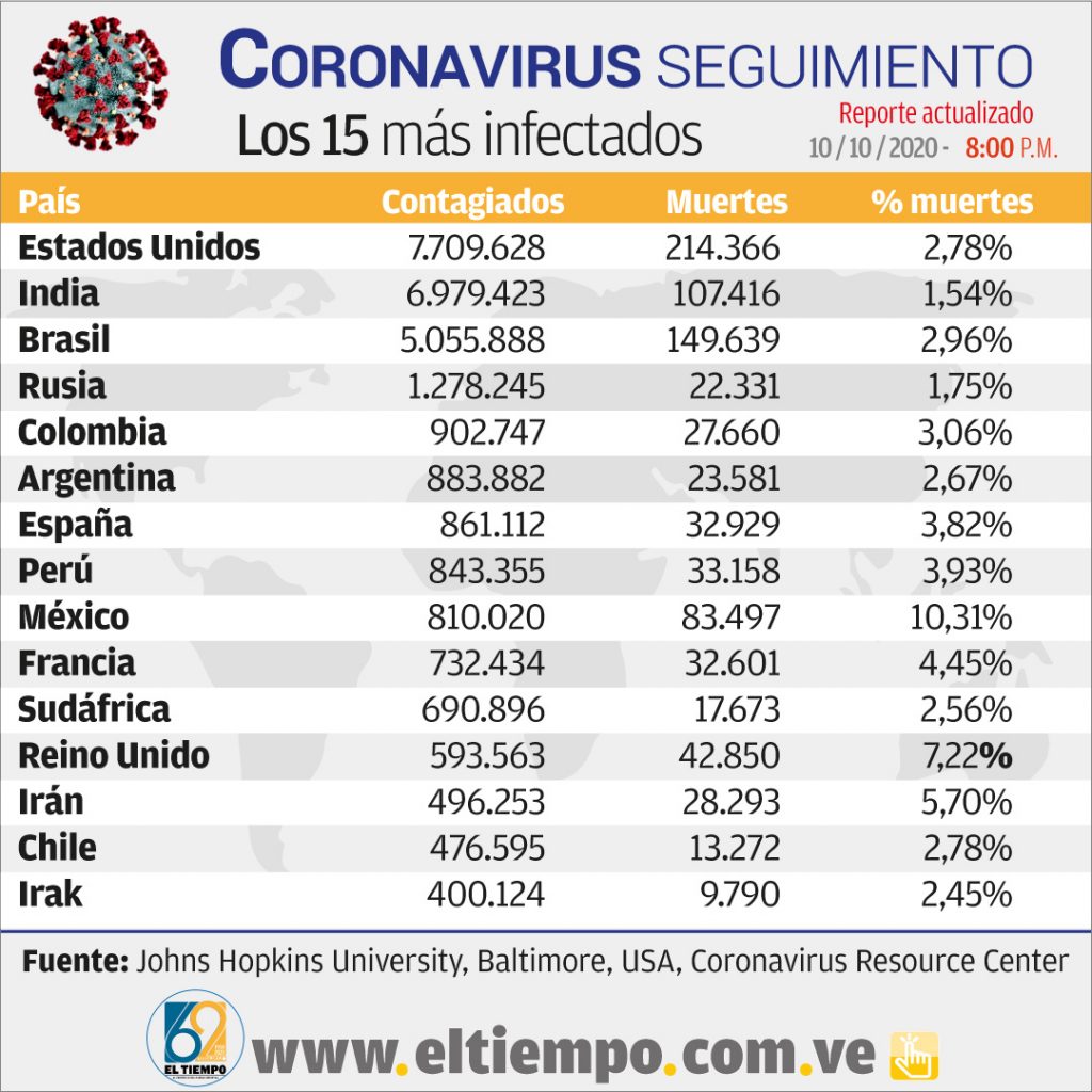 De acuerdo con esa institución, hasta ahora 1.070.990 personas perdieron la vida por causa de la enfermedad que origina problemas respiratorios Estados Unidos, con 7.709.628 infectados y 214.366 fallecidos, es el país más afectado por el COVID-19.
