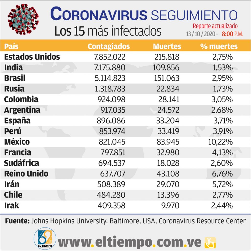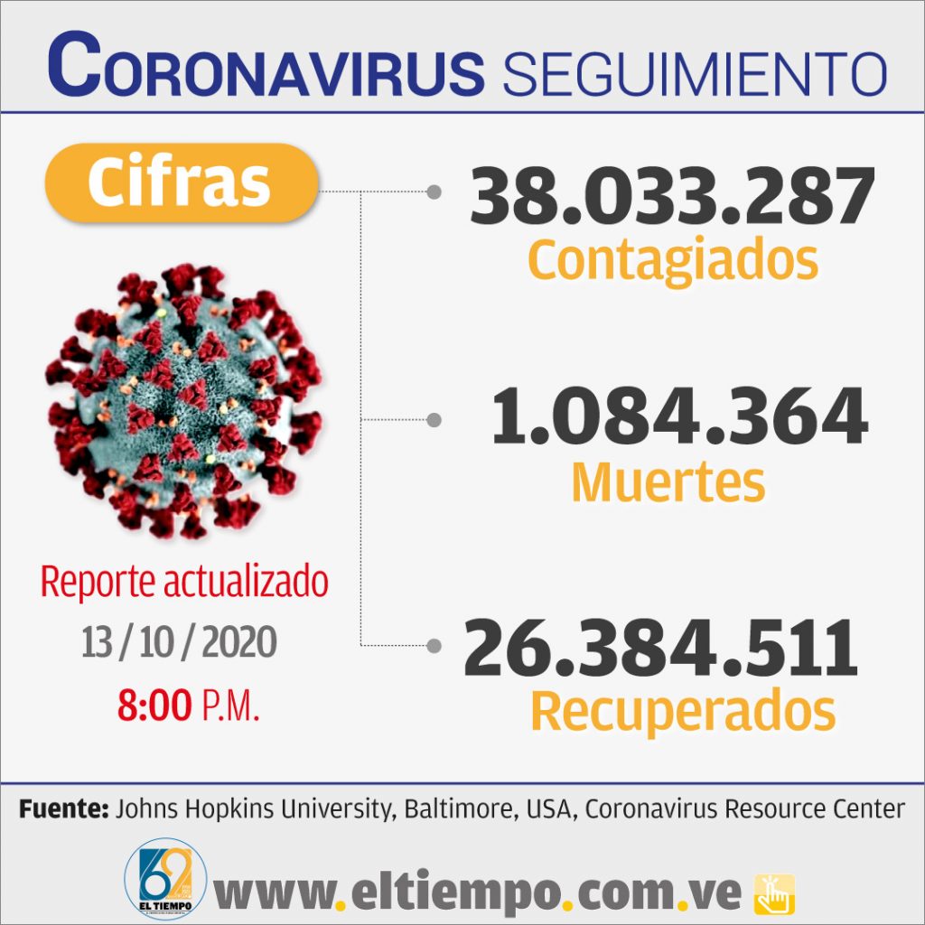 A 38.033.287 se elevaron este martes #13Oct los casos confirmados de coronavirus en todo el mundo, de acuerdo con el conteo de la Universidad Johns Hopkins de Baltimore.