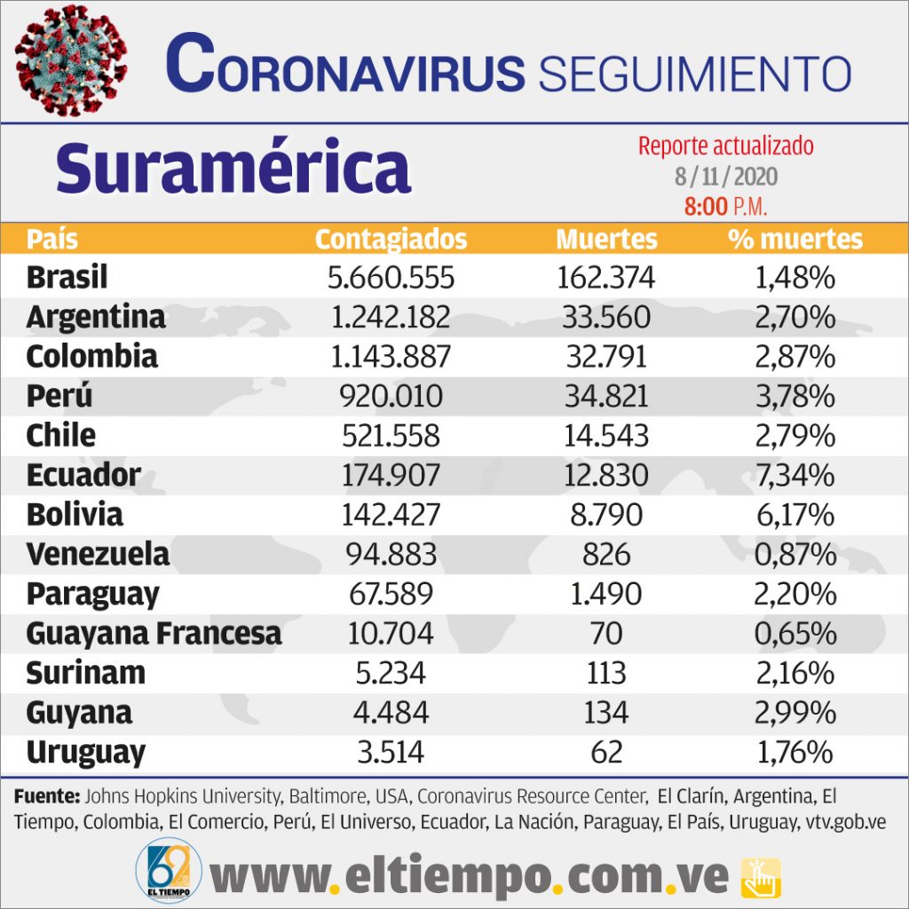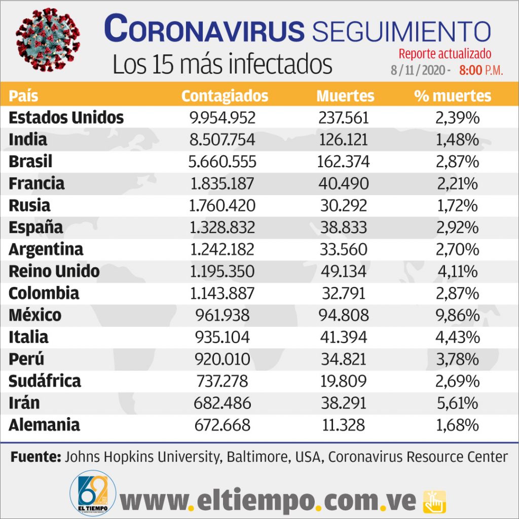 La pandemia ha contagiado en todo el mundo a más de 50 millones de ciudadanos y ha causado la muerte de más de un millón 200 mil pacientes, según el balance de las 8:00 pm de la Universidad Johns Hopkins de Baltimore (EEUU).