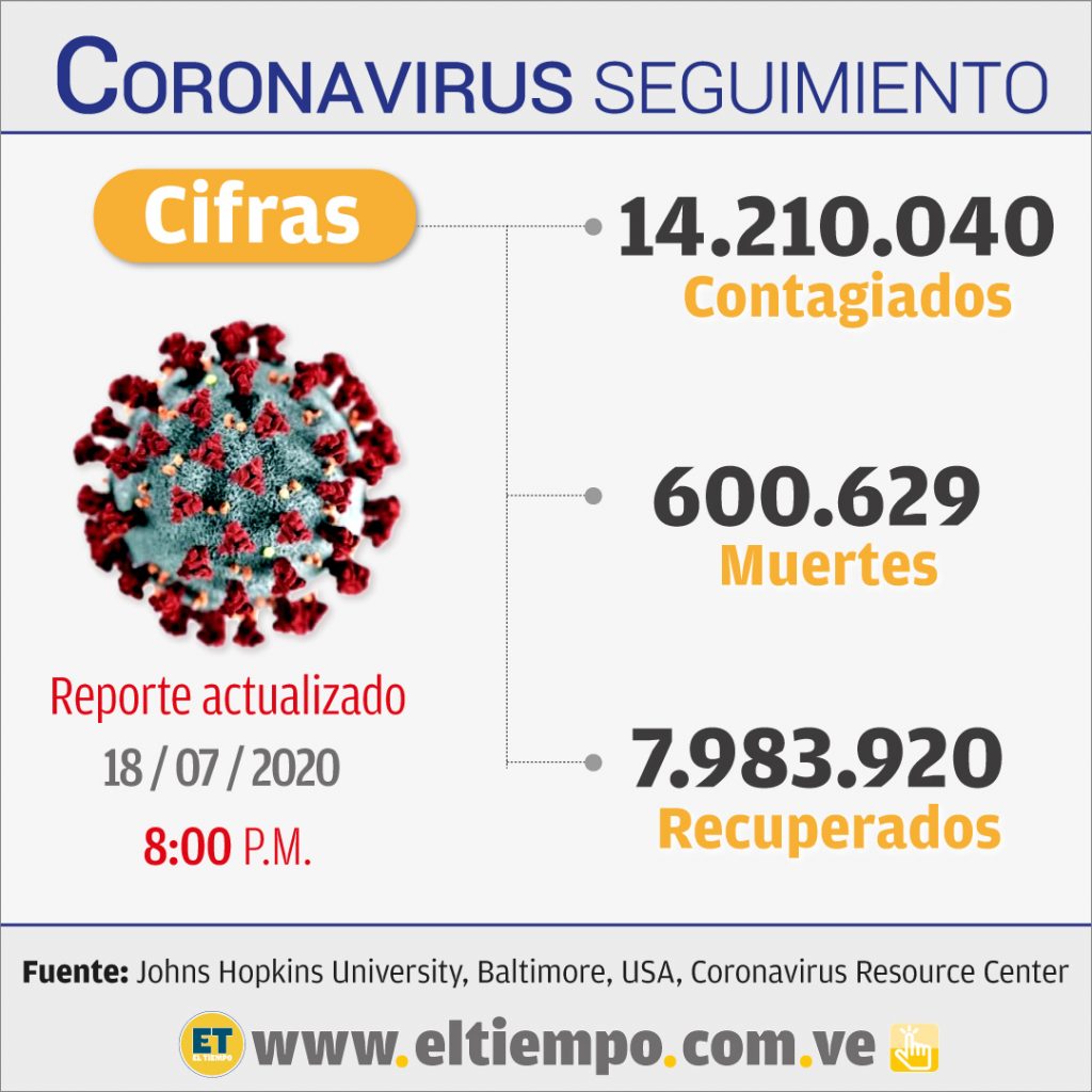 Según los datos recopilados por la Universidad Johns Hopkins de Baltimore (EE UU), en su actualización de las 8:30 de la noche, 14.210.040 han sido portadores de Covid-19, 7.983.920 se han recuperado y unas 600.629 han perdido la batalla contra la enfermedad.