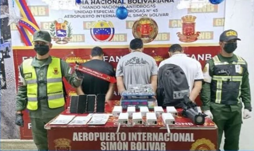 El jefe militar detalló que efectivos del Aeropuerto Internacional Simón Bolívar, en La Guaira (norte), cercano a Caracas, detuvieron al primer hombre, de nacionalidad colombiana, quien pretendía tomar un vuelo con destino a Estambul y llevaba oculto en su equipaje envoltorios de cocaína.