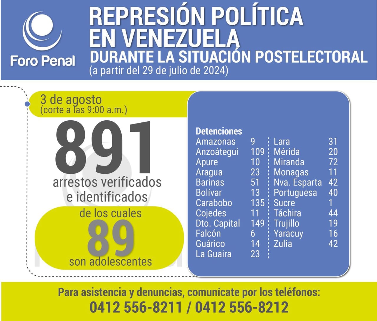 La organización Foro Penal informó, este sábado 2 de agosto, que al menos 89 adolescentes han sido detenidos, desde el pasado 29 de julio, durante las protestas que se han registrados en el país.