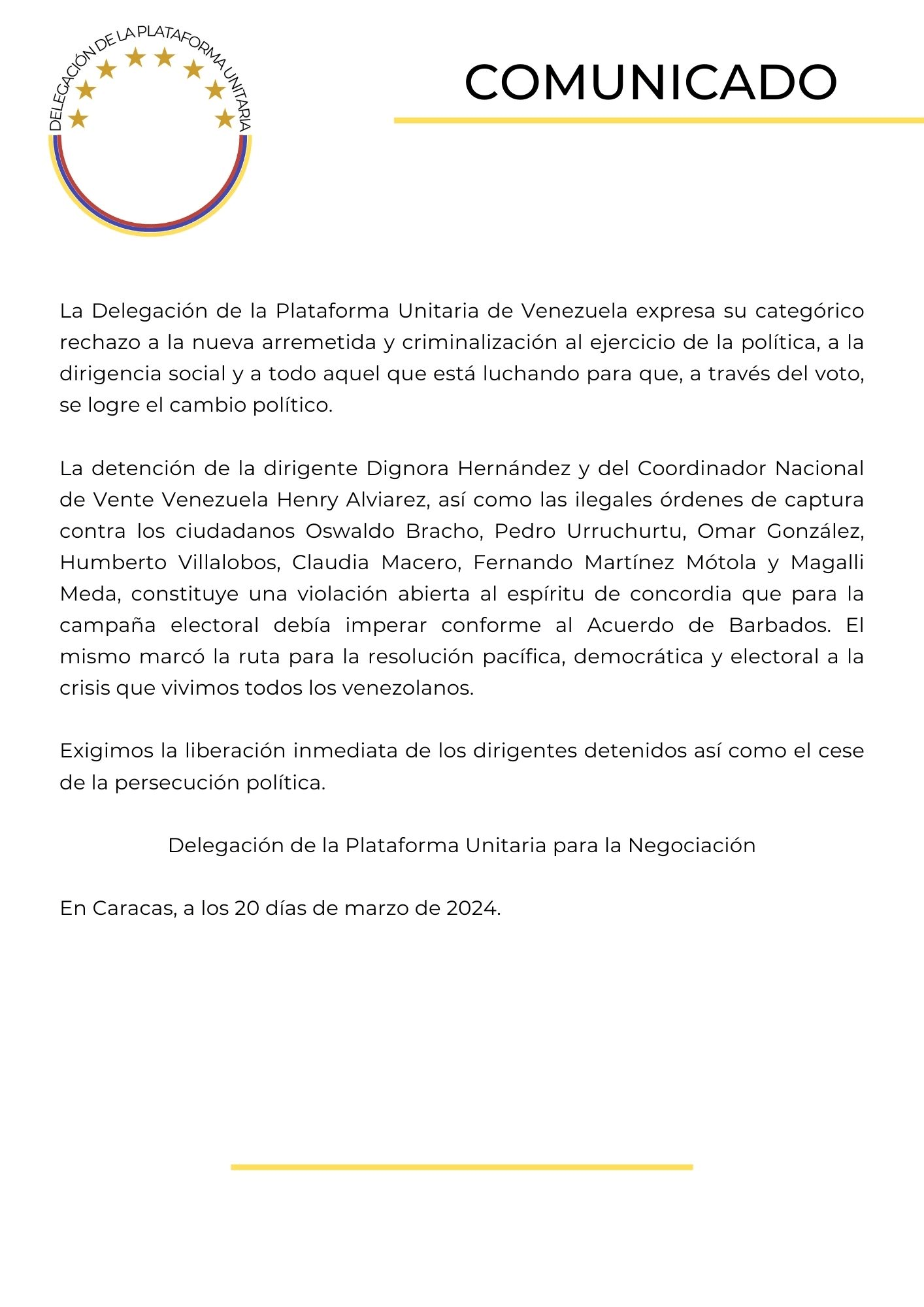 Tras las capturas, la coalición opositora señaló, en un comunicado publicado en X, que estas detenciones junto a las órdenes de captura de otros siete miembros del equipo de VV, liderado por la candidata presidencial María Corina Machado, constituyen una "violación abierta al espíritu de concordia que para la campaña electoral debía imperar conforme el acuerdo de Barbados".
