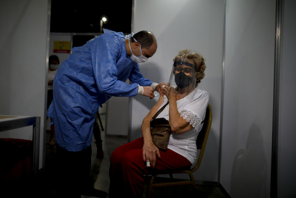 Magdalena Rizzo recibe una inyección contra el COVID-19 en Buenos Aires (AP Foto/Natacha Pisarenko)