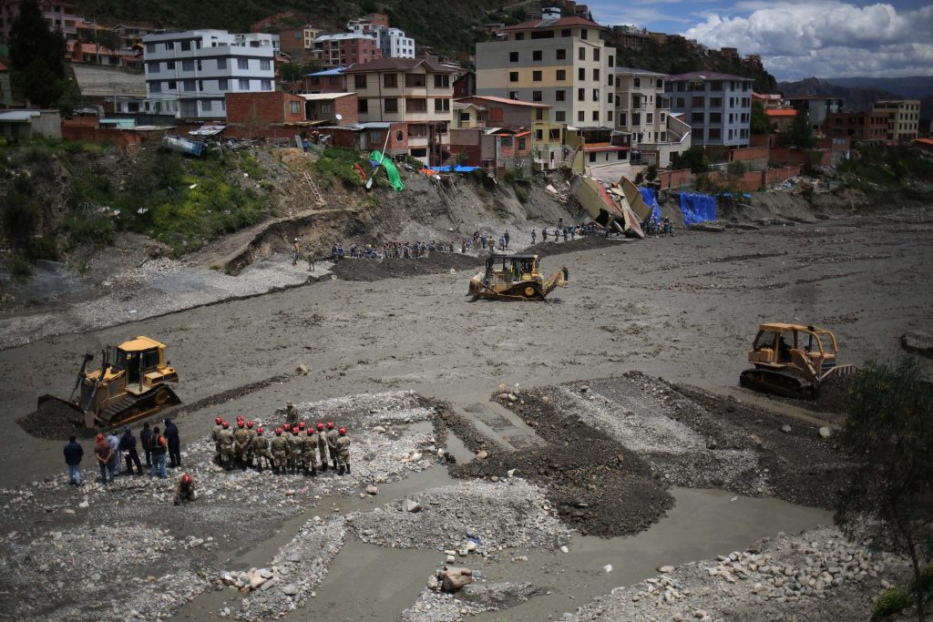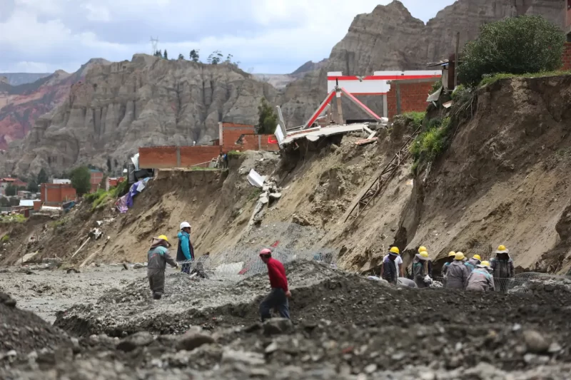 Obreros municipales trabajan cerca de casas colapsadas por la crecida de ríos en la zona Callapa, en La Paz / Foto: Efe