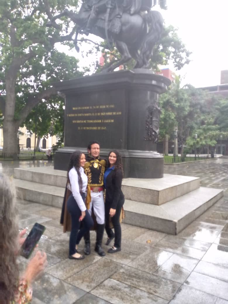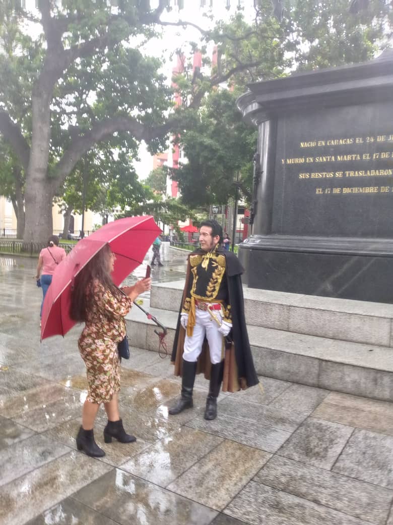 Aprovechando un momento en que el agua dio tregua, un hombre vestido como El Libertador se acercó a la estatua ecuestre del Padre de la Patria para tomarse fotos con los pocos visitantes que allí se encontraban.