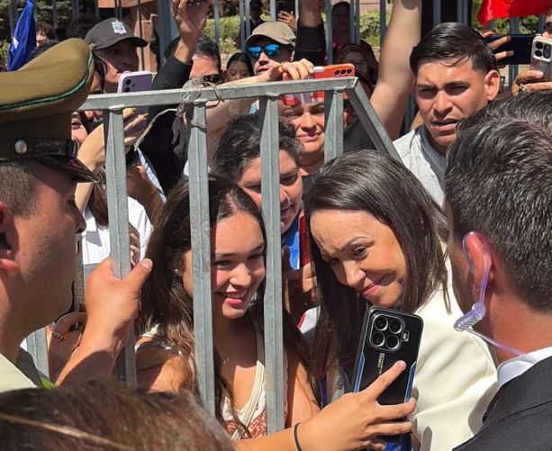 Machado llegó a la ceremonia en medio de una alta expectación y alabada por decenas de venezolanos que se congregaron a las puertas del edificio para saludarla. La dirigente aterrizó en Chile desde Washington, donde recientemente sostuvo su segunda reunión con el presidente estadounidense, Donald Trump.