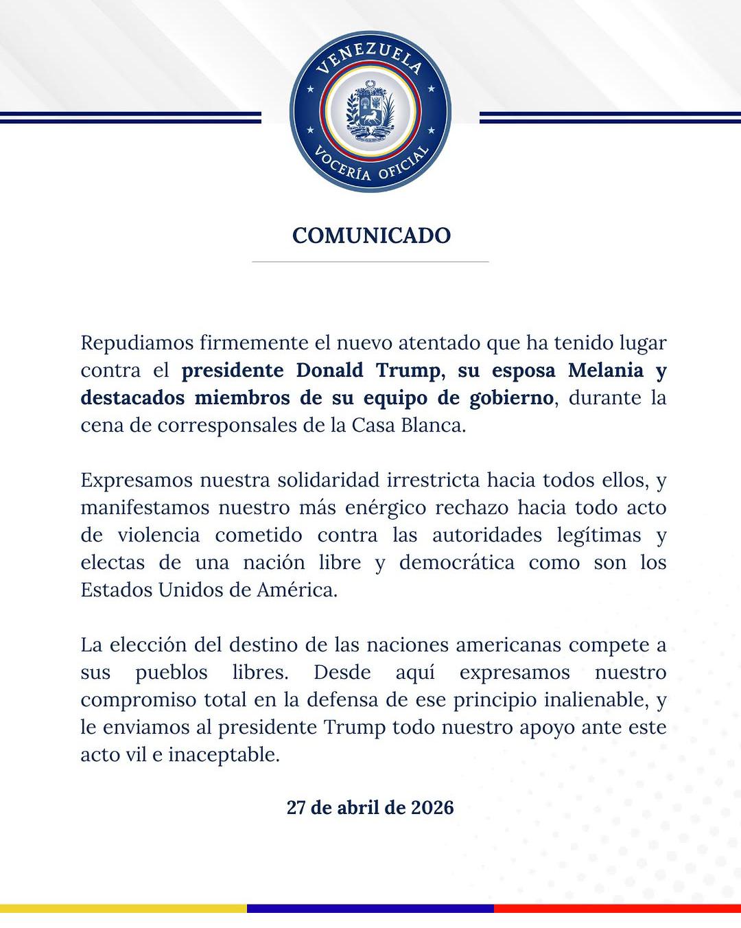 "Repudiamos firmemente el nuevo atentado que ha tenido lugar contra el presidente Donald Trump, su esposa Melania y destacados miembros de su equipo de gobierno durante la cena de corresponsales de la Casa Blanca", indicó la institución que divulga informaciones de Machado y González en un comunicado de prensa, publicado en redes sociales.