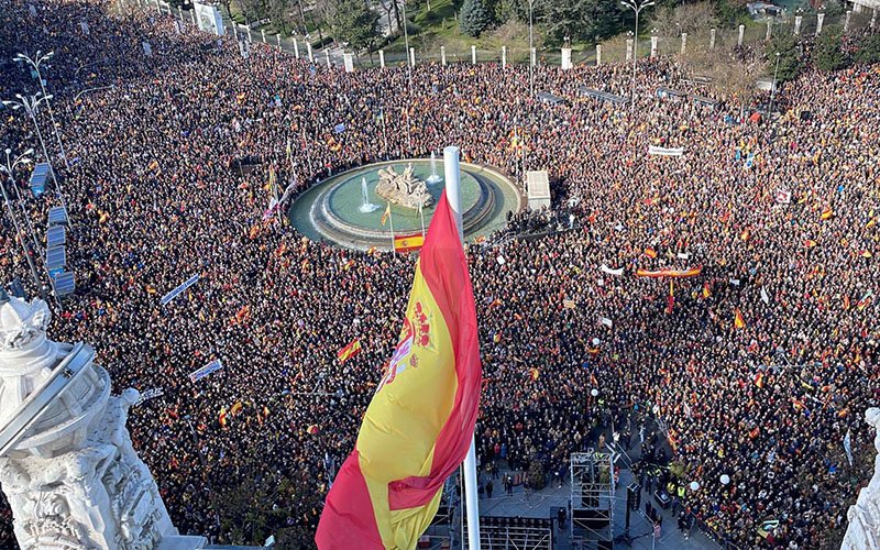 Miles de personas se manifestaron este sábado en la plaza de Cibeles de Madrid, convocados por diversas asociaciones conservadoras y apoyada por los partidos de derecha y extrema derecha (PP, Ciudadanos y Vox) para protestar contra el Gobierno de coalición progresista de del presidente español Pedro Sánchez.