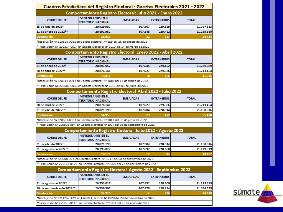 Refiere que los últimos cinco cortes del RE, desde el 31 de enero hasta el 30 de septiembre del 2022, evidencian que el organismo comicial no está cumpliendo con la norma. «Según cuadros estadísticos de últimos seis cortes del Registro Electoral desde el 15 de julio de 2021 hasta el 30 de septiembre de 2022, hay una disminución del número de electores dentro y fuera del país», advierte Súmate.