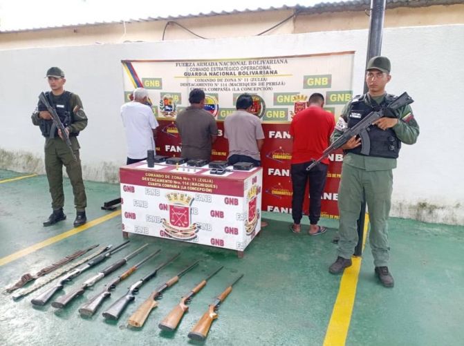 Militares venezolanos detuvieron a cuatro personas en el estado Zulia (noroeste, fronterizo con Colombia) por los presuntos delitos de resistencia a la autoridad y porte ilícito de armas, informó este lunes el comandante estratégico operacional de la Fuerza Armada Nacional Bolivariana (FANB), Domingo Hernández Lárez.