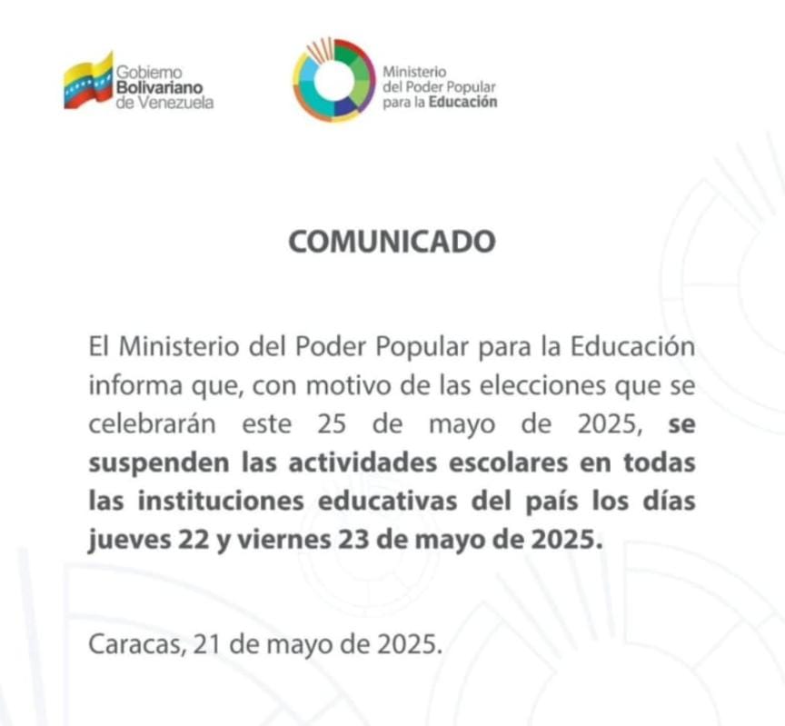 "El Ministerio del Poder Popular para La Educación informa que, con motivo de las elecciones que se celebrarán este 25 de mayo de 2025, se suspenden las actividades escolares en todas las instituciones educativas del país los días jueves 22 y viernes 23 de mayo de 2025", publicó Rodríguez en su cuenta @hectorrodriguezcastro de la mencionada red social.