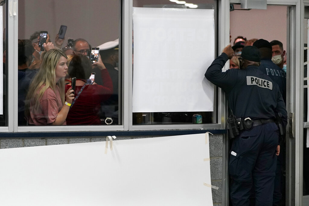 Un video grabado por medios locales mostraba a gente enfadada reunida afuera del centro de convenciones TCF y dentro del vestíbulo, coreando “¡Detengan el conteo!” y “¡Detengan la votación!”. Había policías alineados para evitar que ingresaran a la zona de conteo.