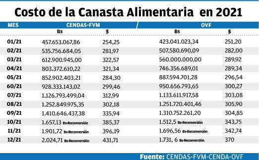 Según el último reporte del Centro de Documentación y Análisis Social de la Federación Venezolana de Maestros (Cendas-FVM), la Canasta Alimentaria Familiar (CAF) se ubicó en diciembre en Bs 2 mil 024,71 ($431,71), lo que significa un aumento de 6,5% respecto al mes anterior.