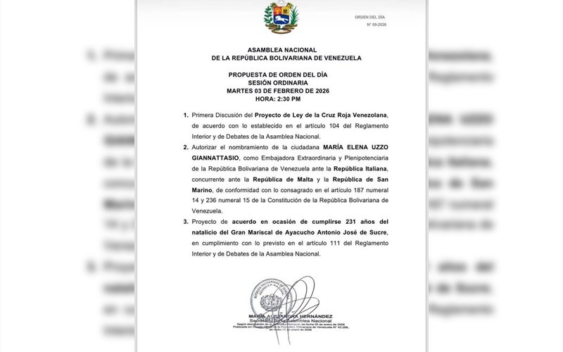 La Asamblea Nacional (AN) difundió a través de X su propuesta de Orden del Día para la Sesión Ordinaria de este martes 3 de febrero, que tendrá lugar a las 2:30 de la tarde en el Palacio Federal Legislativo.