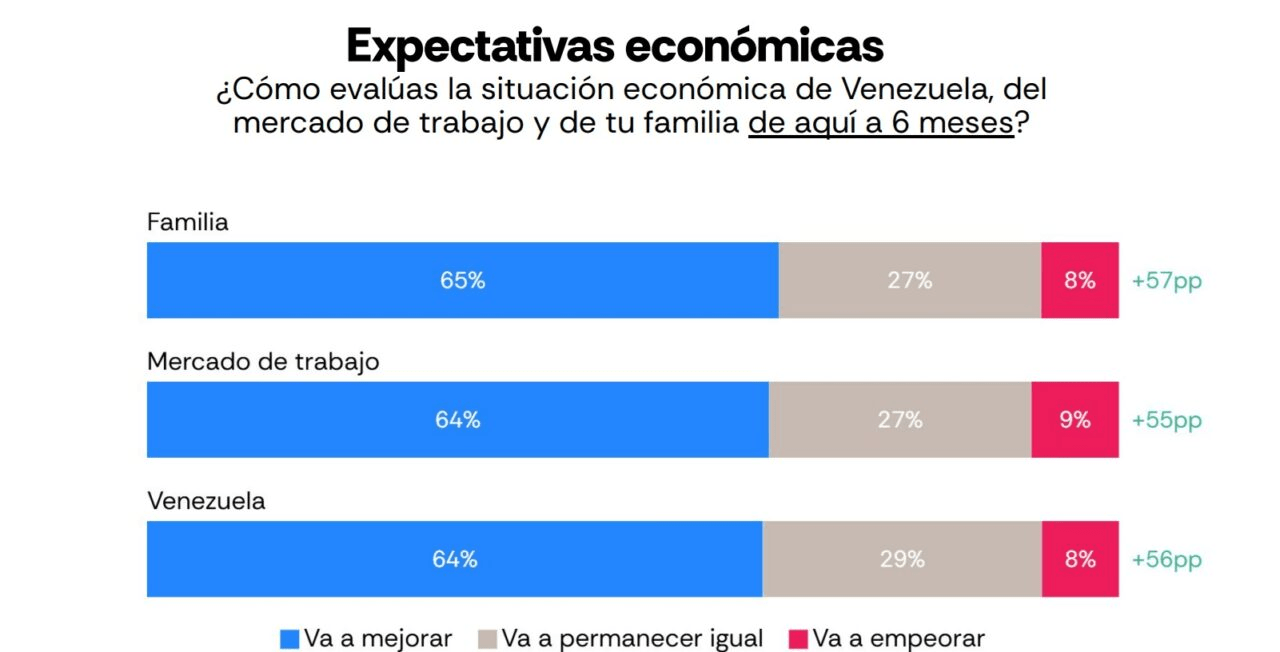 Al consultarles sobre cómo evalúan la situación económica de Venezuela “de aquí a seis meses”, el 29 % de los encuestados señaló que el escenario se mantendrá igual. Un 8 % fue más pesimista y dijo que “va a empeorar”.