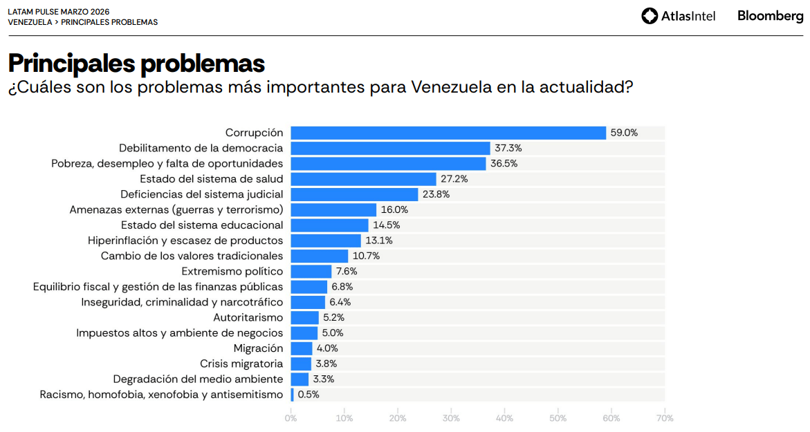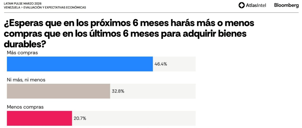 Casi ocho de cada 10 venezolanos considera que la situación económica actual del país es mala. Sin embargo, 6 de cada 10 tiene la expectativa de que el panorama va a mejorar de aquí en los próximos seis meses, reveló el informe Latam Pulse marzo 2026, elaborado por la empresa de investigación de mercado AtlasIntel en alianza con Bloomberg.