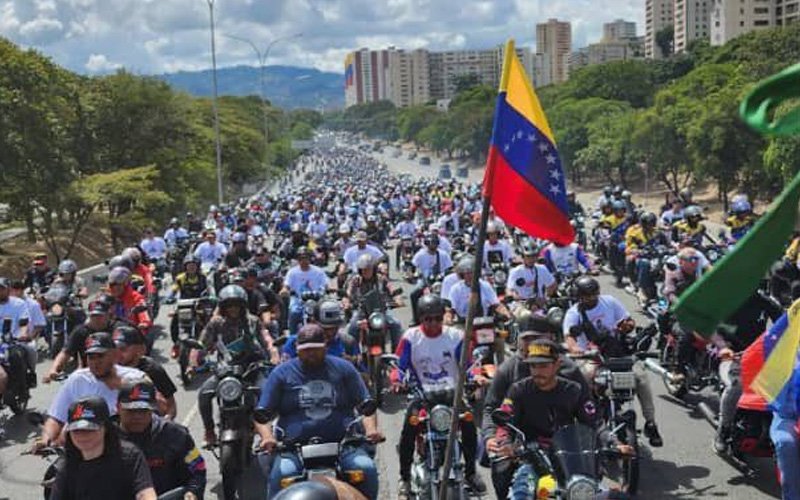 La caravana está encabezada por motociclistas que, en su mayoría, van vestidos de blanco, mientras portan banderas de Venezuela y tocan las bocinas de sus vehículos.