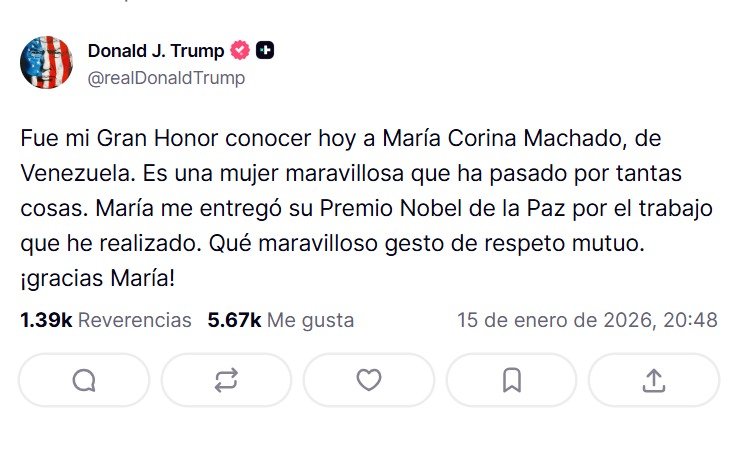 Trump, en una publicación de su cuenta oficial de Truth Social, dijo que fue "un gran honor" conocer a Machado y que le "obsequió" la insignia de del premio debido al "trabajo" que ha realizado durante su gestión.