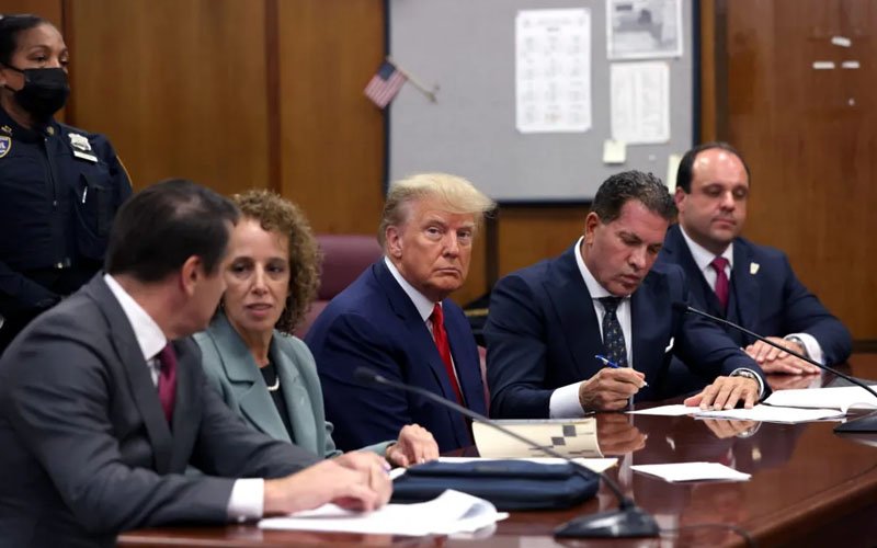 Trump, que se convirtió en el primer presidente estadounidense en afrontar cargos penales, se presentó ante el juez del tribunal neoyorquino de Manhattan Juan Manuel Merchan poco después de entregarse a la Fiscalía, donde le leyeron sus derechos y se le sacó ficha.