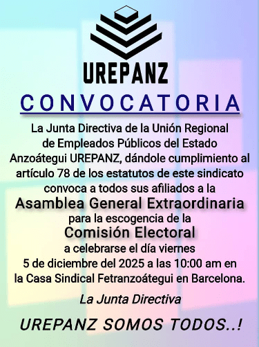 El sindicato Unión Regional de Empleados Públicos de Anzoátegui (Urepanz) convocó este lunes a sus 1.700 afiliados a una asamblea general extraordinaria, pautada para el viernes 5 de diciembre, para escoger la comisión electoral que se encargará de regir el proceso de escogencia de la nueva junta directiva de la organización.