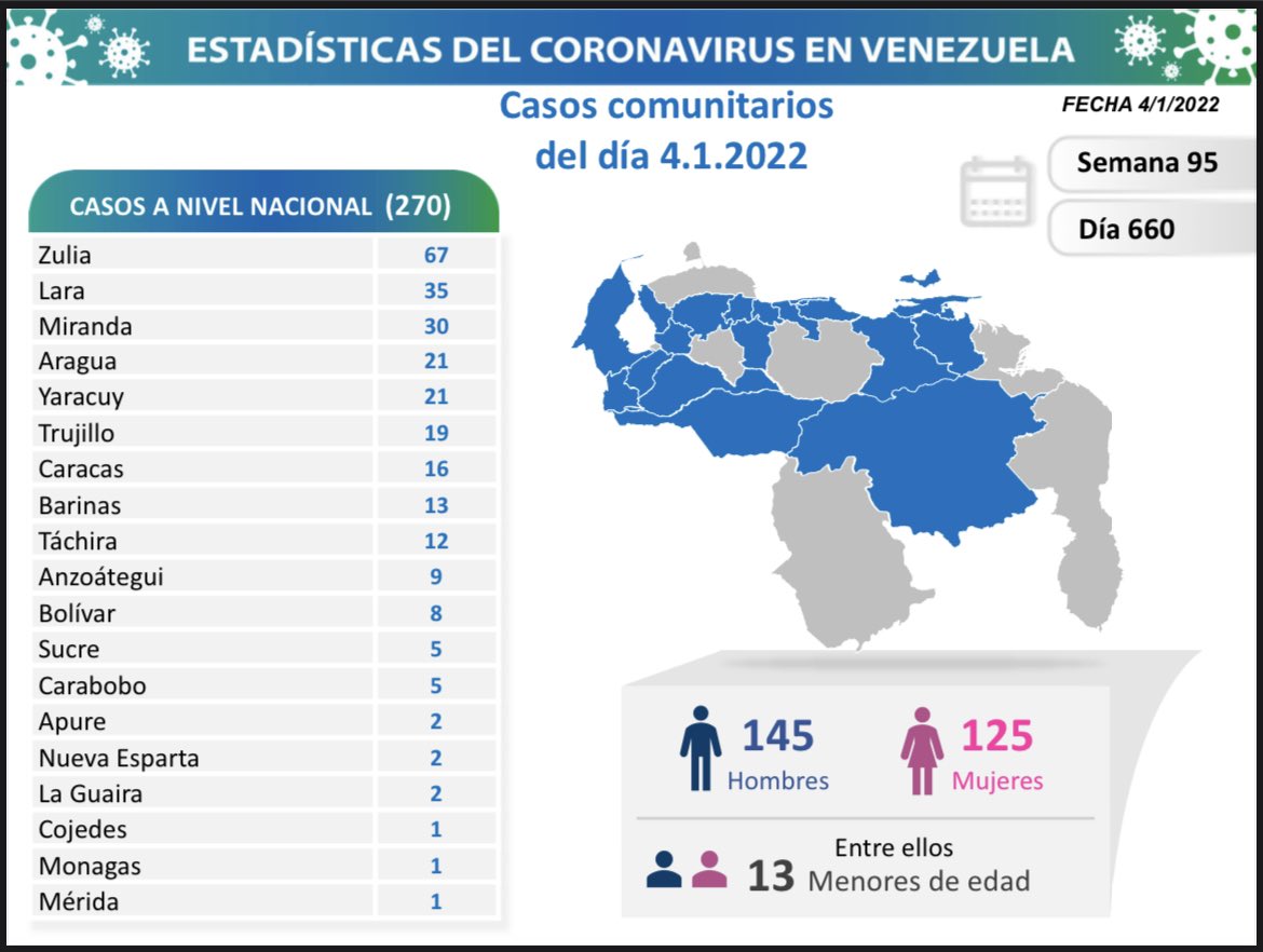 La vicepresidenta de la República, Delcy Rodríguez, informó este martes 4 de enero, que en las últimas 24 horas se registraron 287 nuevos casos positivos de coronavirus en el país: 270 casos de transmisión comunitaria y 17 importados.
